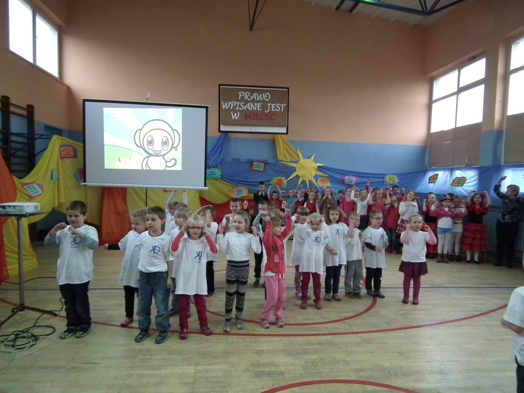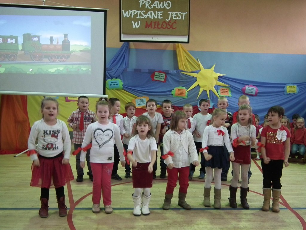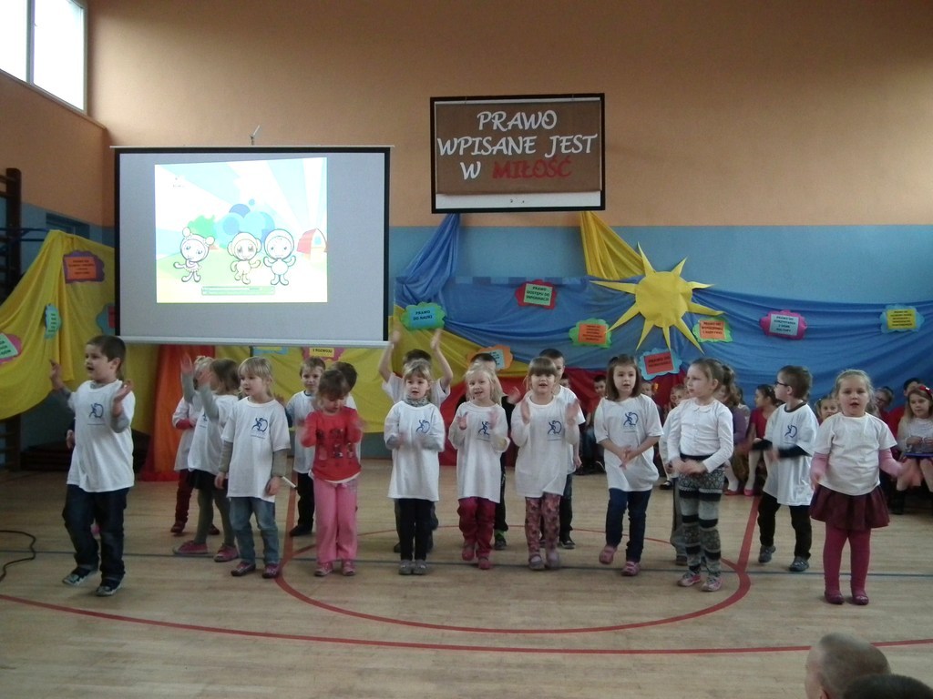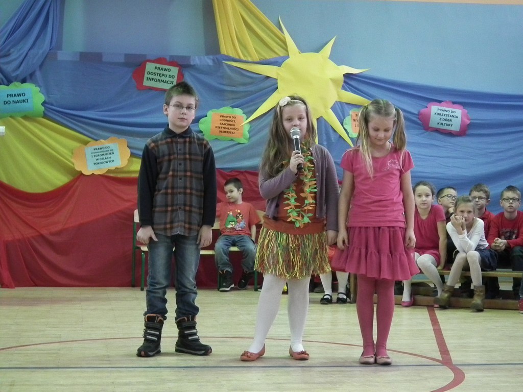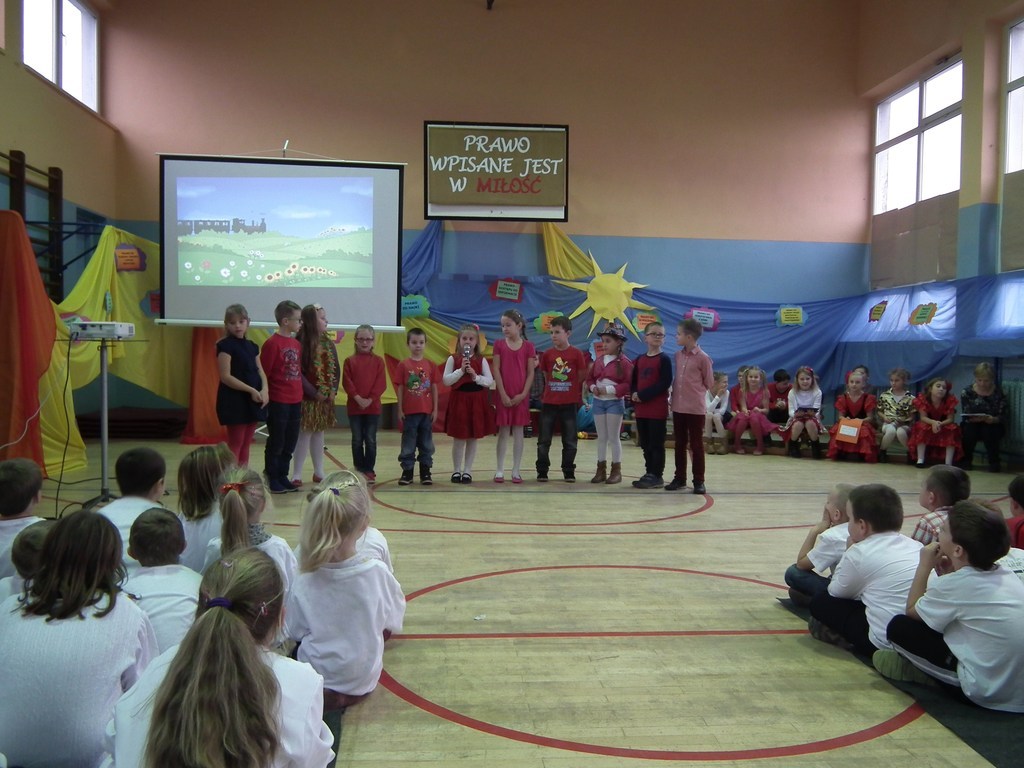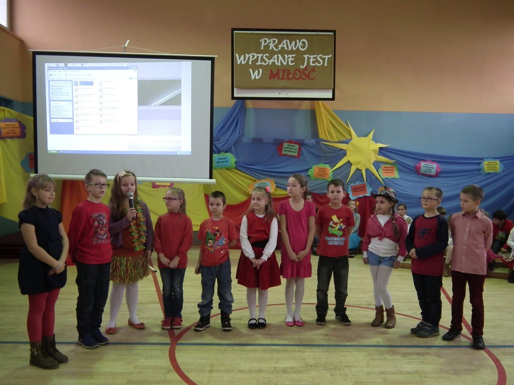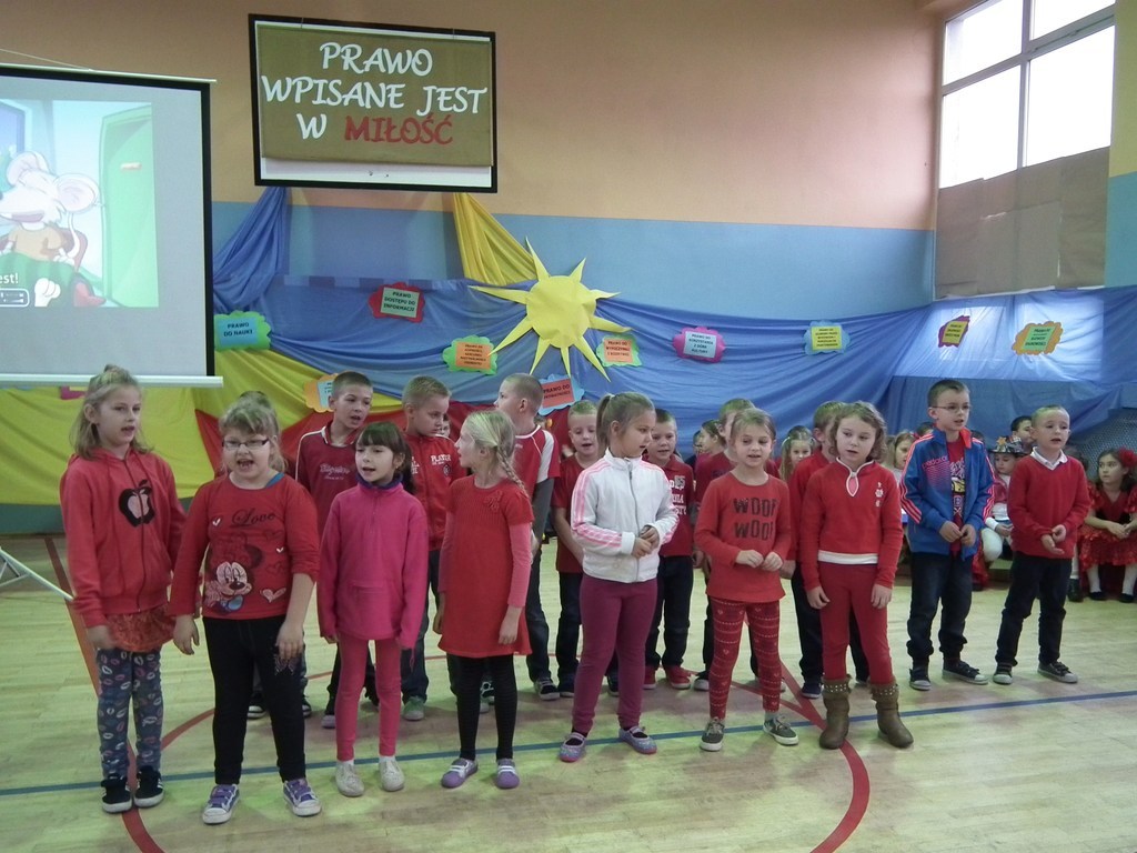 Prawo wpisane jest w miłość - pod tym hasłem panie B. Janiak i B. Stałowska przygotowały z uczniami piękne wiersze i piosenki mówiące o przyjaźni, o umiejętnym korzystaniu z praw przez dzieci, aby wszystkim żyło się dobrze i żeby nikt przez nikogo nie płakał.