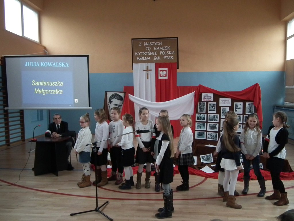 Społeczność uczniowska podziękowała Szanownym Gościom za spotkanie piosenką powstańczą ,,Sanitariuszka Małgorzatka” w wykonaniu uczennicy klasy II Julii Kowalskiej z chórkiem oraz wierszem ,,Rodzicom” K. K. Baczyńskiego, który wyrecytowała Weronika Kostrzewska z klasy VI b, a także pamiątkowym dyplomem.