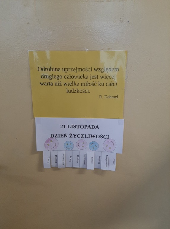 Tego dnia na drzwiach wejściowych naszej szkoły pojawiły się okolicznościowe plakaty, w różnych miejscach szkoły można znaleźć cytaty i przysłowia traktujące o uprzejmości, a przedstawiciele Samorządu Uczniowskiego rozdawali uczniom, nauczycielom i pracownikom szkoły plakietki ze zwrotami grzecznościowymi. Aby być życzliwym i uśmiechniętym nie potrzebujemy specjalnego święta. Jednak dobrze, że jest taki dzień, który nam o tym przypomina.